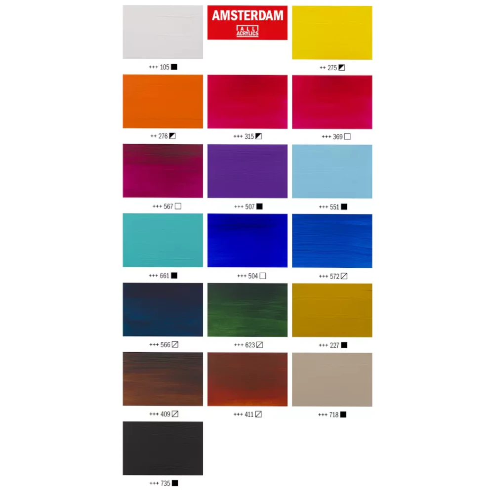 Amsterdam-akryylivärit ovat taiteilijalaatua ja tunnettuja erinomaisesta valonkestostaan. Jokainen väri sisältää puhtaita, haalistumattomia pigmenttejä ja 100 % akryylihartsiin perustuvan sideaineen, joka tekee maalikalvosta kestävän ja pitkäikäisen. Värit säilyttävät hehkunsa vuosienkin jälkeen, ja ne kuivuvat kauniin mattapintaisiksi.