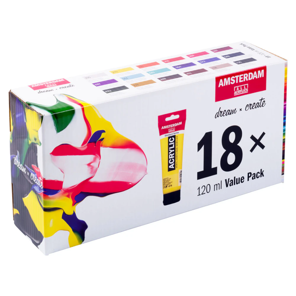 Amsterdam akryylivärit 18 x 120 ml -setti on unelmapakkaus kaikille, jotka haluavat aloittaa akryylimaalauksen laadukkailla ja monipuolisilla väreillä. Tämä laaja lajitelma sisältää 18 suosittua Amsterdam-sävyä, joilla harjoittelet väriyhdistelmiä, sävyeroja ja erilaisia maalaustekniikoita helposti – olitpa sitten aloitteleva taiteilija, harrastaja tai lahjaa etsivä luovalle ystävälle.